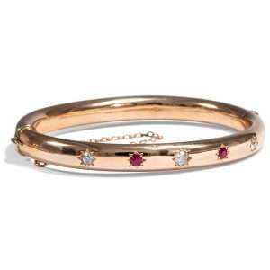 | Material: | 40 natürliche, unbehandelte Rubine aus Burma (no heat!), zus. 13,00 ct, max. 5,00 mm Durchmesser Sieben Diamanten im Brillantschliff, zus. 0,22 ct, Feines Weiß (Top Wesselton, G) – Weiß (Wesselton, H), vsi – pi Die Fassungen der Diamanten aus Platin Gold 750/000, entspricht 18 Karat |